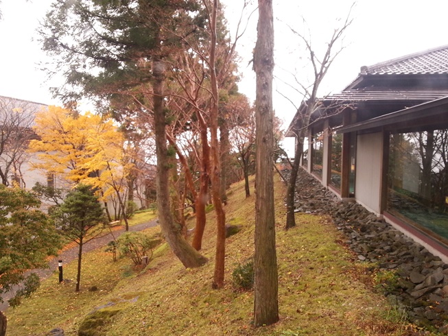 こんなかんじで紅葉も素晴らしい庭園が、廊下の全面ガラスから見られるという贅沢な施設だ。